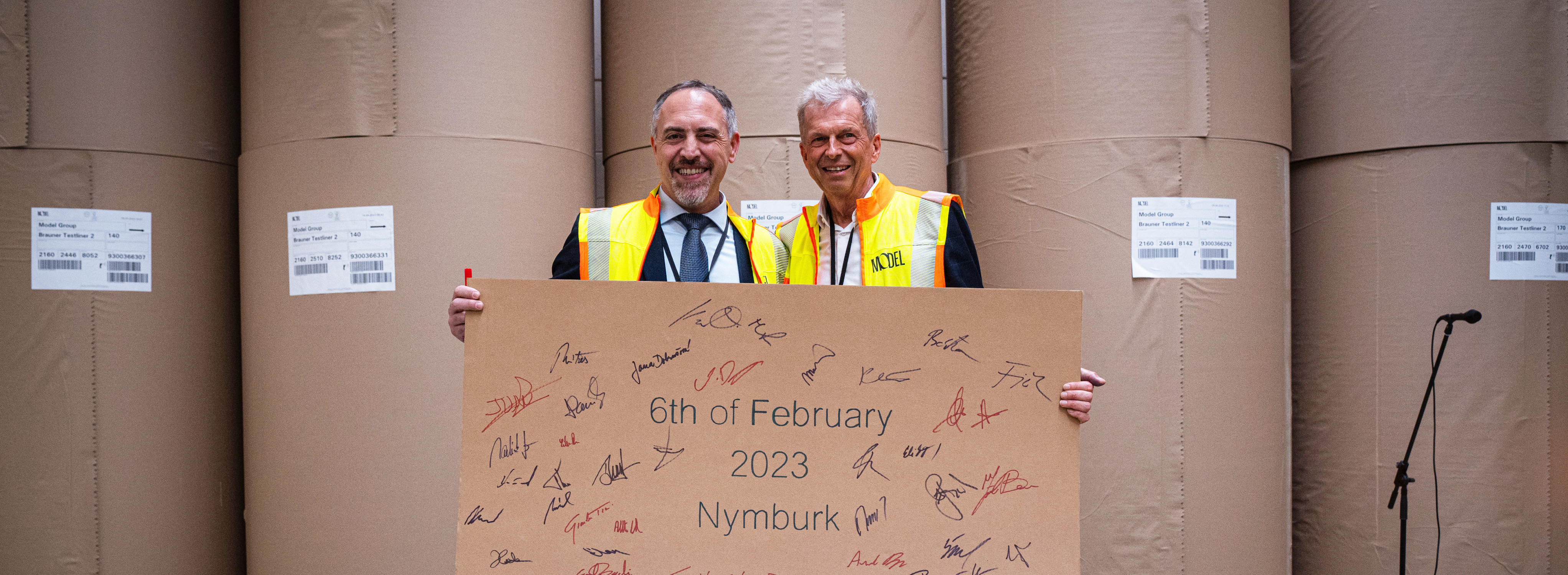 Die brandneue Wellpappanlage Fosber S/Line 420 im Werk Model Obaly Nymburk wurde gemeinsam vom CEO und Firmeninhaber der Model Group Dr. Daniel Model und dem CEO des Technologielieferanten Fosber Group Marco Bertola in Anwesenheit von mehr als 60 hochkarätigen Gästen, darunter Kunden und Vertreterinnen und Vertretern der Stadt Nymburk und der Region Mittelböhmen, eingeweiht.